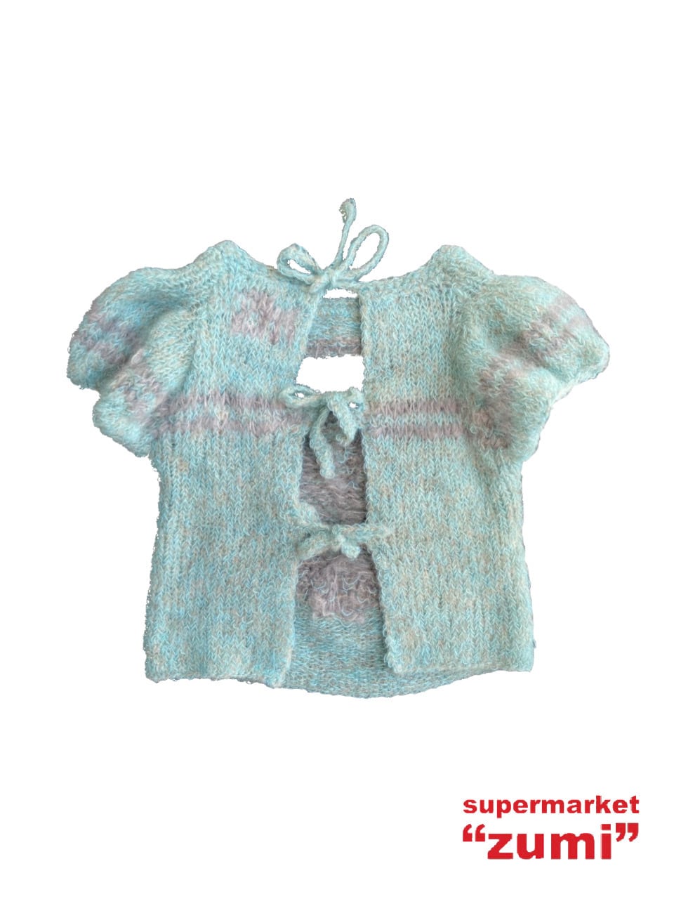 サイズ SIZE : ONE SIZE 全長 LENGTH : SHOULDER23cm WIDE29cm SLEEVE11cm HIGH29cm 色 COLOR : BLUE 素材 MATERIAL : 80%KID MOHAIR 10%ACRYLIC 10%POLYESTER MADE IN JAPAN